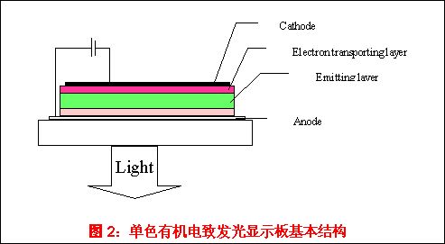 小型单色有机电致发光器件基本上都是三层结构。全色OLED显示器为多层结构,一般超过三层。